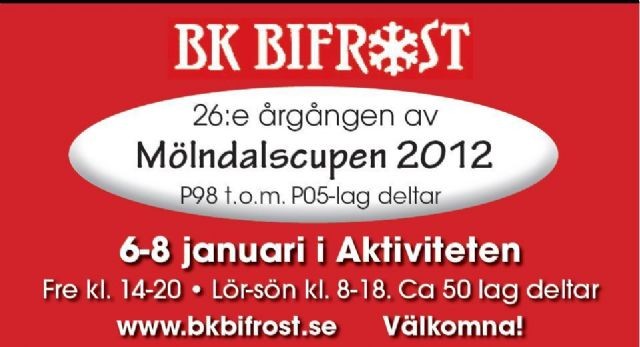 BK Bifrosts 26:e årgång av Mölndalscupen 6-8 januari 2012 i Aktiviteten Resultat för cupen hittar du här Mölndals Cupen 2012 Tack alla killar,ledare och föräldrar med fler för en jättefin cup P98:1:a Mölnlycke grå,2:a Azalea svart, 3:a Azalea blå och 4:a Mölnlycke svart och Fair Play till Bifrost/Dalen vit P02:1:a Kungsladugård,2:a Landvetter vit, 3:a Torslanda 2 och 4:a Landvetter grön och Fair Play till Öjesjö 2 P03 GRATTIS alla 10 lag och Azalea för Fair play START TIDER : P04 GRATTIS alla 10 lag och Hovås/Billdal 1 för Fair play P05 GRATTIS alla 10 lag och för Fair play Välkomna nästa år igen mvh BK Bifrost o MölndalsCupen 2012 BK Bifrost Fotbollsklubb Mölndal 21 sep 2011 0kommentarer